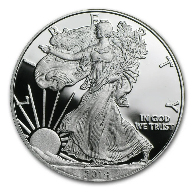 The obverse side of the coin features the iconic Walking Liberty design with the sun ascending behind her. She is draped in the American flag, carrying an oak branch symbolizing strength and independence. The top of the rim is encircled with the word "LIBERTY;" "IN GOD WE TRUST" is inscribed on the left. The year of the coin is etched below her feet.